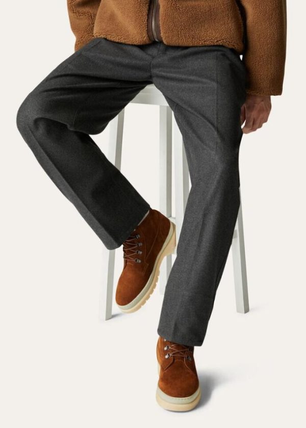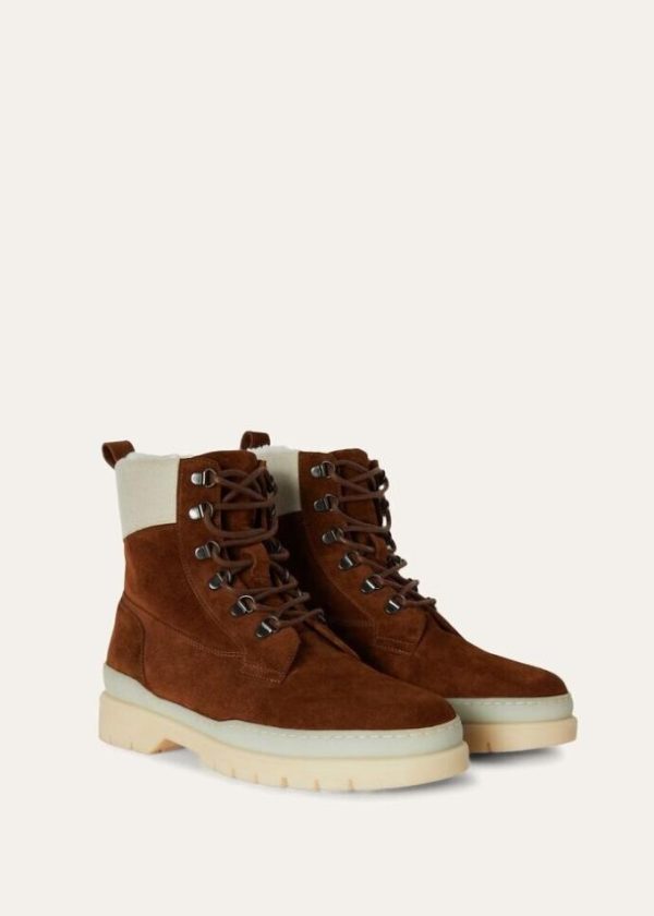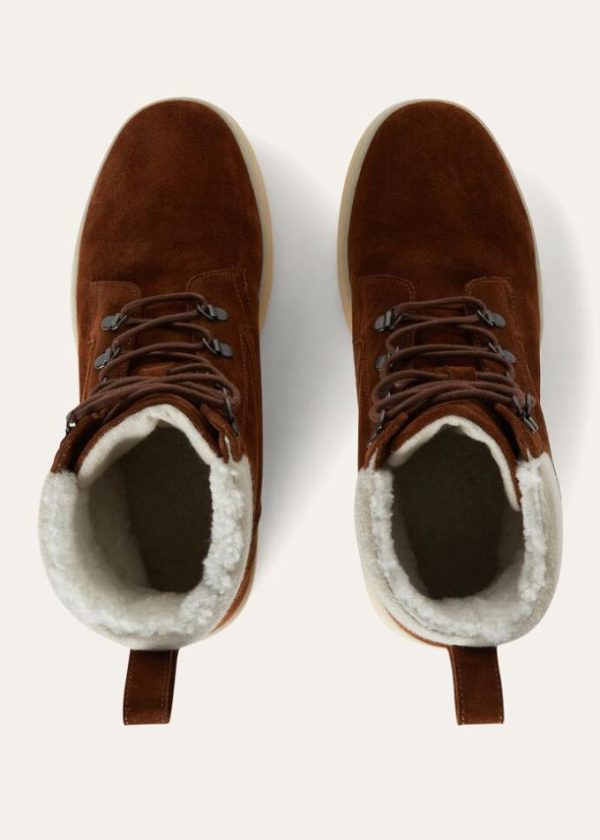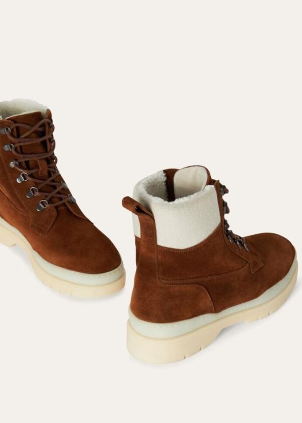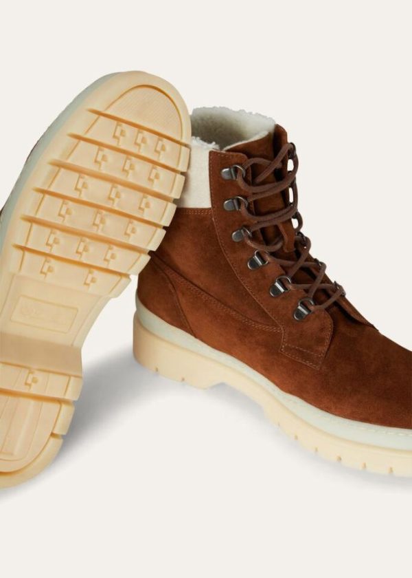 These classic, padded, lace-up, mid-cut hiking boots feature large, lugged White Soles. For the Autumn/Winter season, they are available in suede with Storm System® cashmere trim and water-resistant shearling lining. A comfortable style that is perfect for walking in the mountains or on the coldest days of the year.