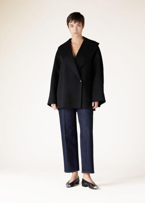 A generously cut single-button double-breasted coat, a wonder in double-layer cashmere that offers an exquisitely warm, enveloping embrace. This model has a flared cut and a shawl collar that falls almost to the shoulders, embracing you with its warmth. With slightly dropped shoulders to accentuate the voluminous line, and intricate vertical stitching for additional interest and volume, this sophisticated outerwear option is a testament to comfort and style.