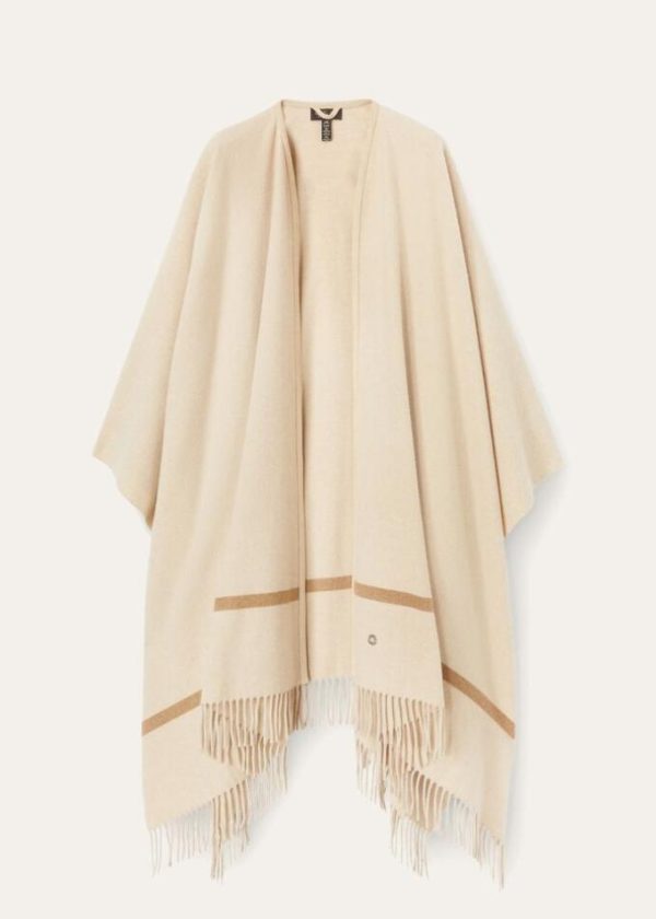 Cape in ultra-soft baby cashmere finished with a tonal suede border. The perfect complement to casual looks both in the mountains and the city, it is styled with narrow contrasting bands at the base and long fringe trim.