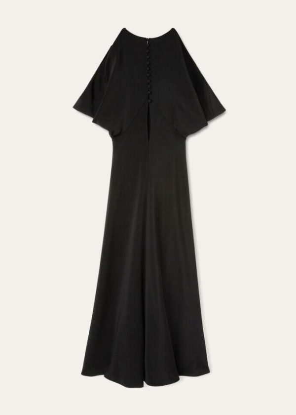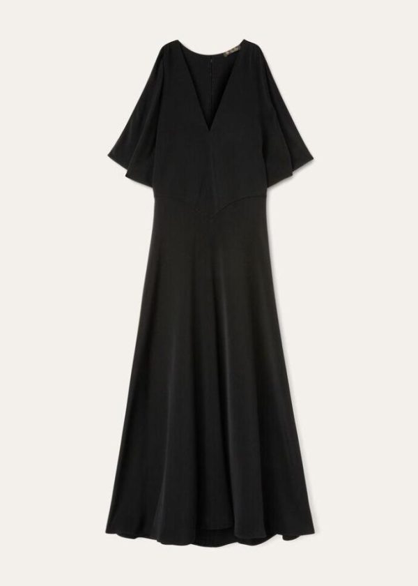 Christmas festivities and events are embodied in the splendor of refined textures and elegant silhouettes. The lightweight Milena cape dress features a plunging front V-neck, while the high waist adds volume and draped movement to the skirt. Crafted from matte crêpe silk cady, it boasts a lush, full-bodied texture and an extremely feminine, elegant, flowing silhouette.