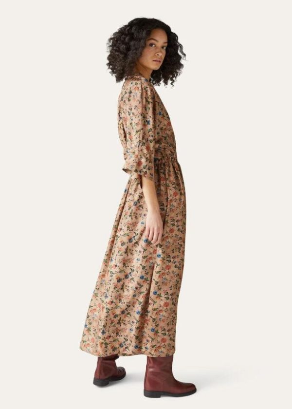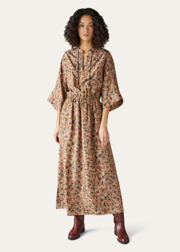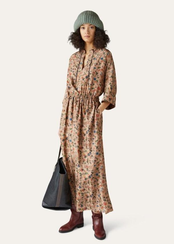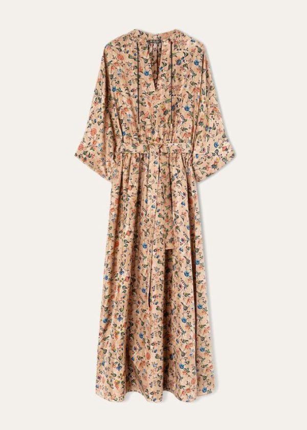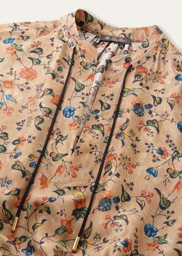 This clean-lined, V-neck tunic dress features a Mandarin collar and multi-colored floral motif, evoking the allure of ancient Andean cultures. It is crafted from silk habutai with a texture that is uniquely soft and warm to the touch. The silhouette accentuates the waist line, while the skirt is comprised of open panels for flowing, feminine movement.