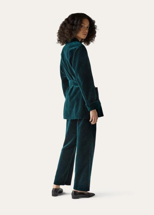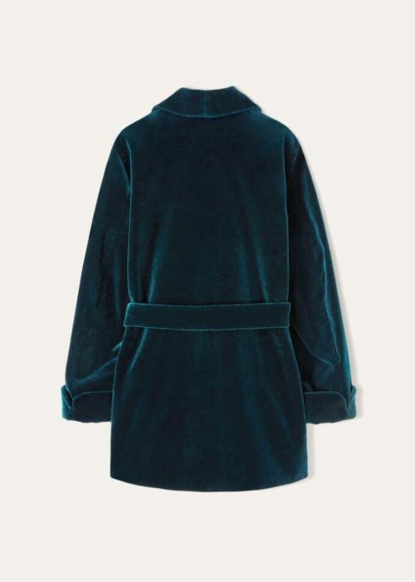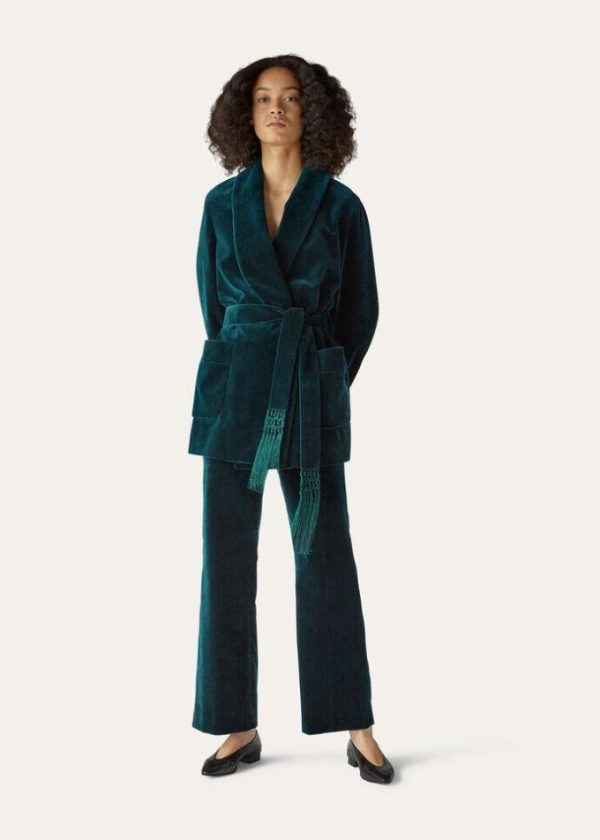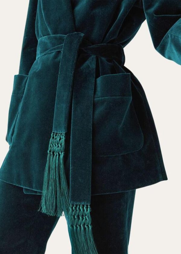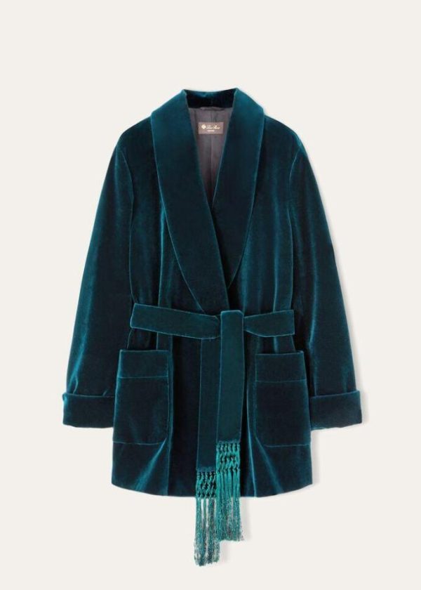 Christmas festivities and events are embodied in the splendor of refined textures and elegant silhouettes. Inspired by classic, vintage-style dressing gowns, the long, velvet Raniya jacket features a flowing shawl collar. A refined belt knots at the waist that is enhanced with hand-braided fringes at the bottom. Soft and fluffy to the touch, its compact, plain-knit texture reflects the light, creating a subtle sheen that accentuates its cozy volumes.
