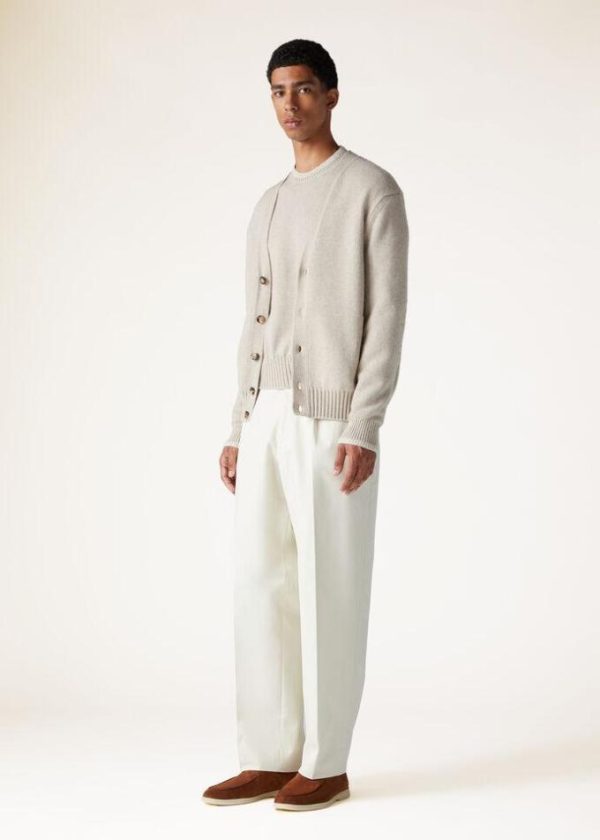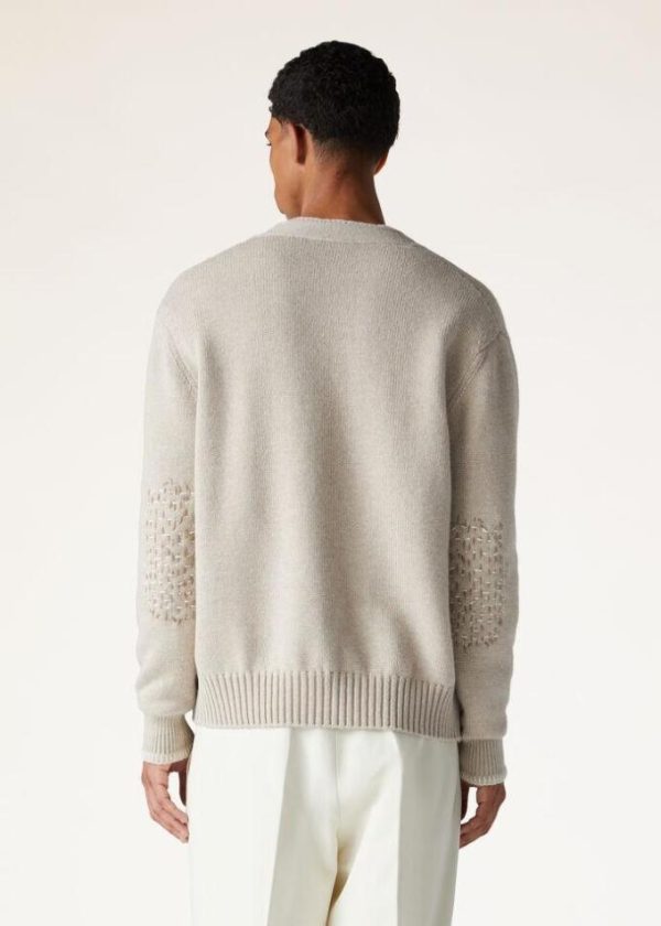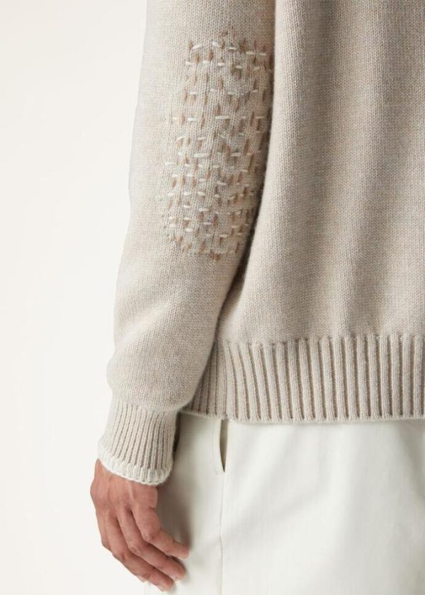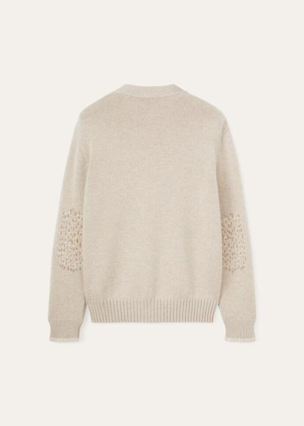 In the ever-shifting poetry of nature’s beauty, the Ashi cardigan emerges as an inspired knitwear piece. Crafted from plain-knit baby cashmere, this crewneck jumper is adorned with a hand-embroidered motif in Cashmere Coarsehair® yarn inspired by darning, which enriches the borders and elbow patches with exquisite handwork. A sophisticated piece with great layering potential.