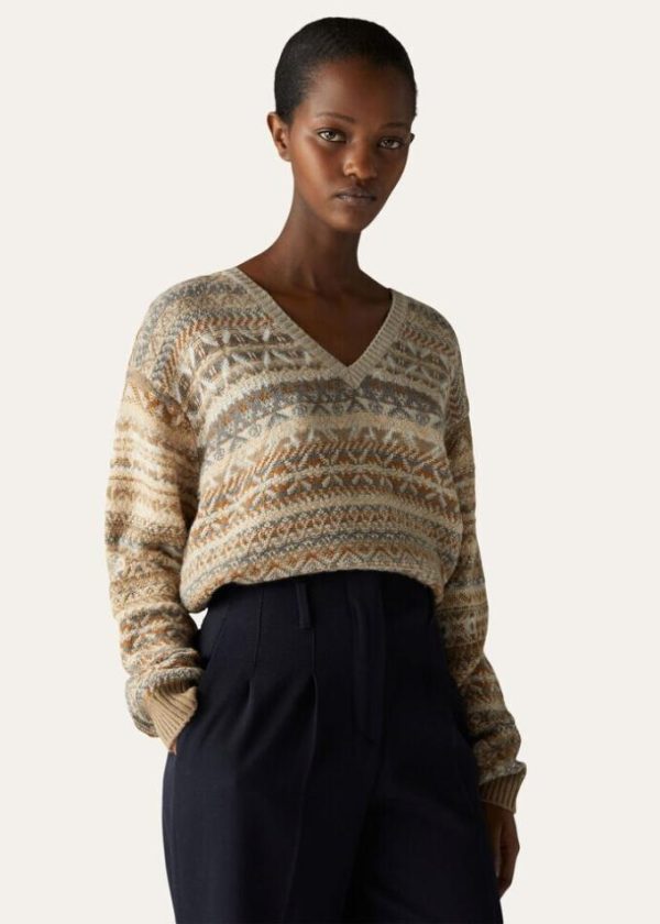 With its incredible variety of breathtaking natural wonders, Australia inspires a collection of knitwear defined by natural shades and a practical-yet-playful allure. Crafted from bouclé cashmere yarn, this V-neck sweater features a full-bodied, fluffy texture with a colorful, three-dimensional jacquard pattern. A minimalist pullover with a striking visual impact.