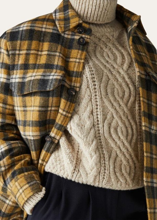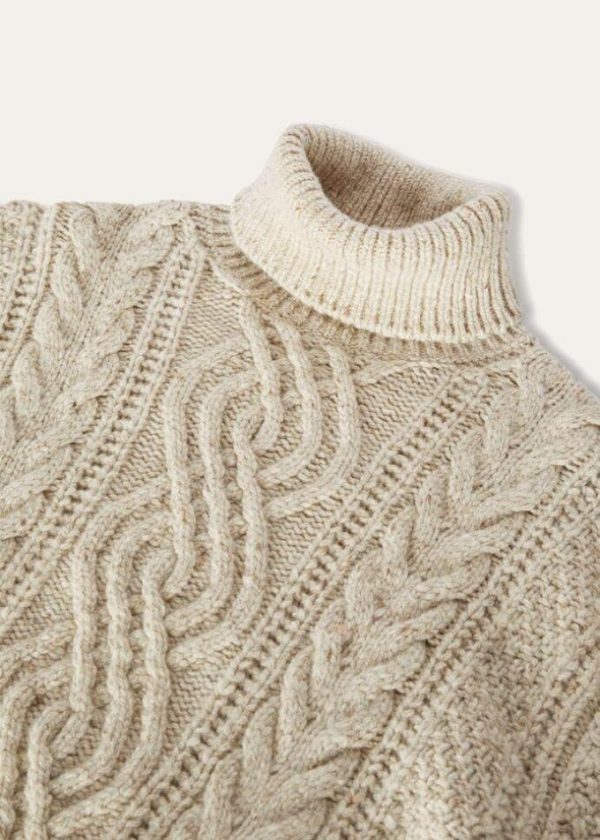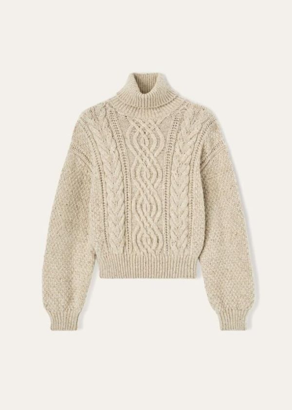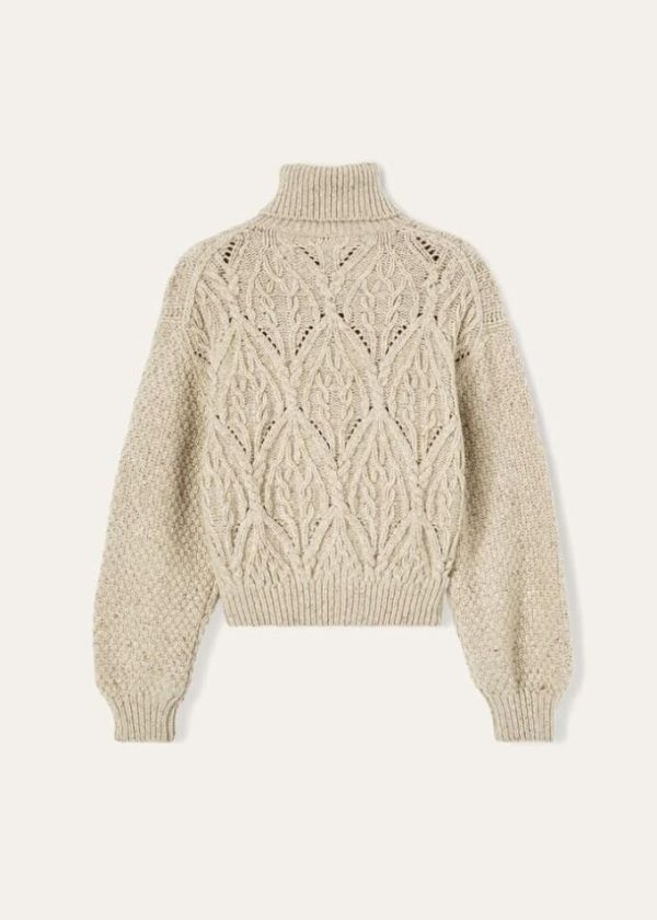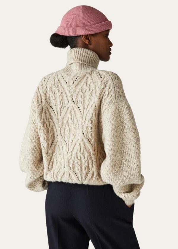 Flowing, comfortable mock-neck sweater made from cashmere-and-wool yarn. It lightly rests on the waist, creating a puffed look. The sophisticated textured knit pattern is enhanced by an over-all play on color.