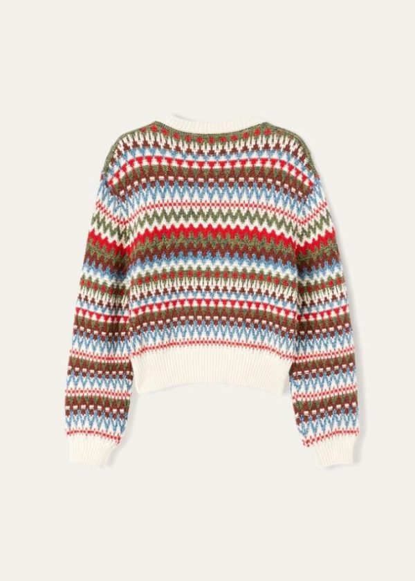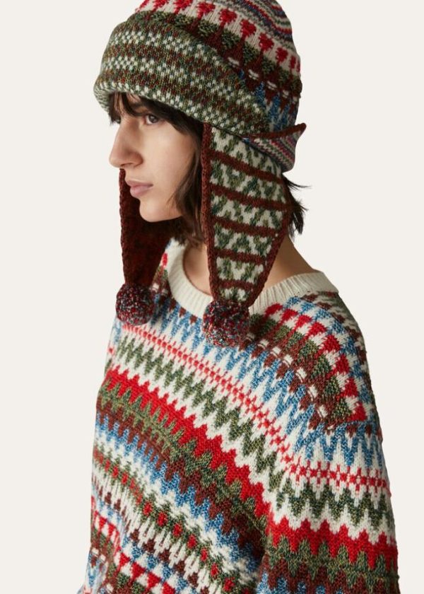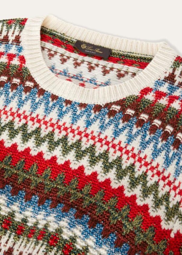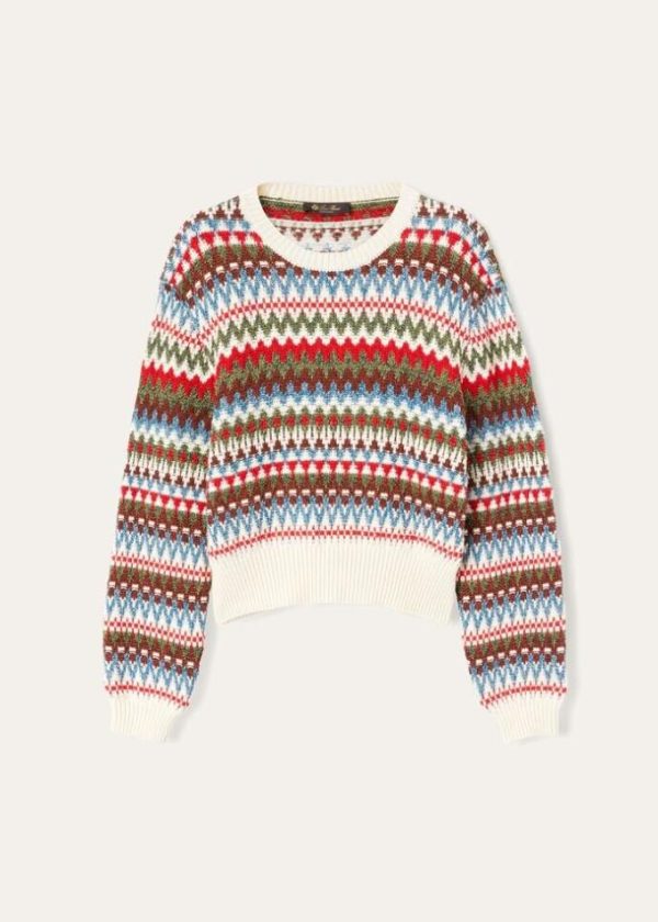 This crew neck features bold colors and a sophisticated jacquard design, evoking the rarefied ambiance of the Central Andes. Crafted from ultra-lightweight silk-and-cotton yarn, it is decorated with an all-over, multi-colored, zigzag pattern. Its lightly puffed silhouette is defined by pop-art colors and a playful allure, while the wide trim is crafted from contrasting Coarsehair® cashmere with a full-bodied texture, providing volume to the body and sleeves.