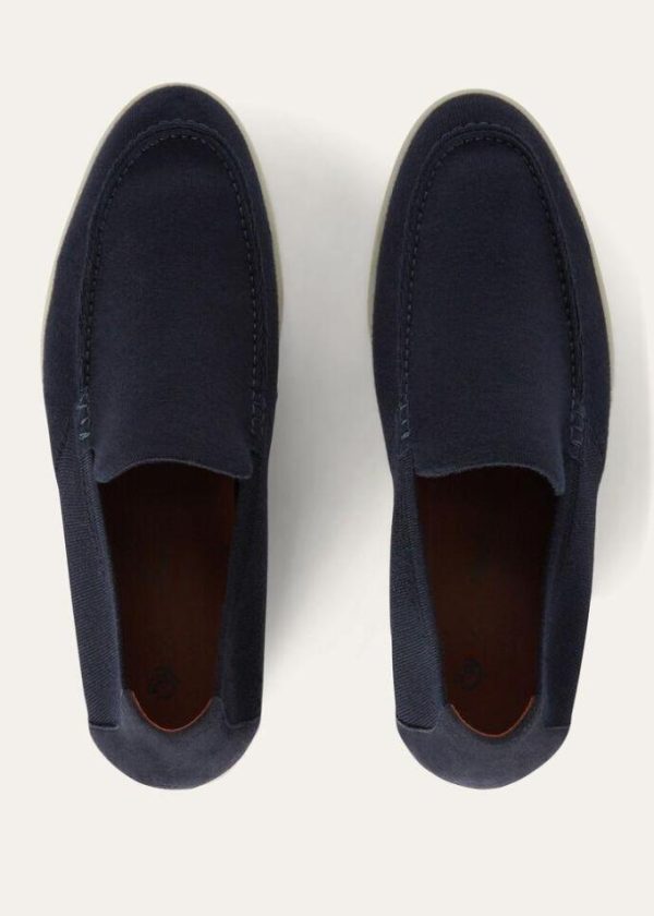 Loro Piana loafers made from knit Wish® wool. Prior to being joined to their rubber soles, the uppers are crafted on a loom — just like a sweater. They are defined by a water-repellent Rain System® treatment and sophisticated suede details.
