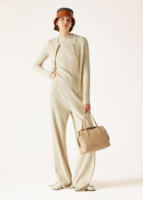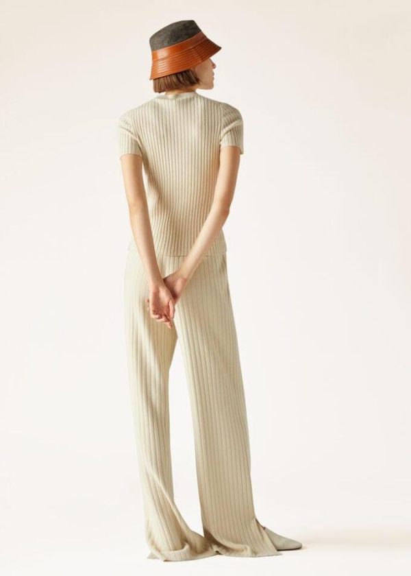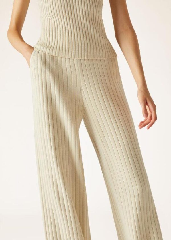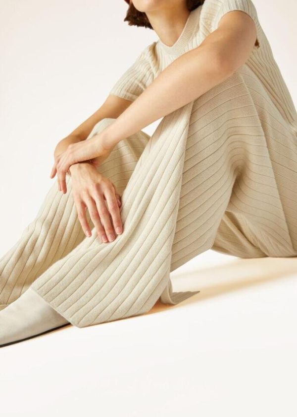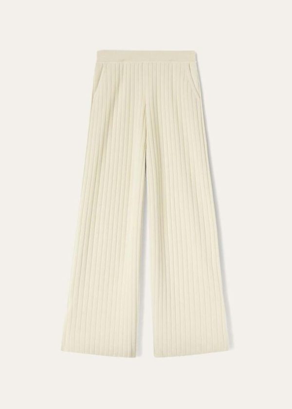 Wide-legged pants made from lightweight, naturally stretch baby cashmere yarn. This flowing style is enhanced by comfortable, soft ribbing. The extremely lightweight, fluffy yarn feels pleasant against the skin.