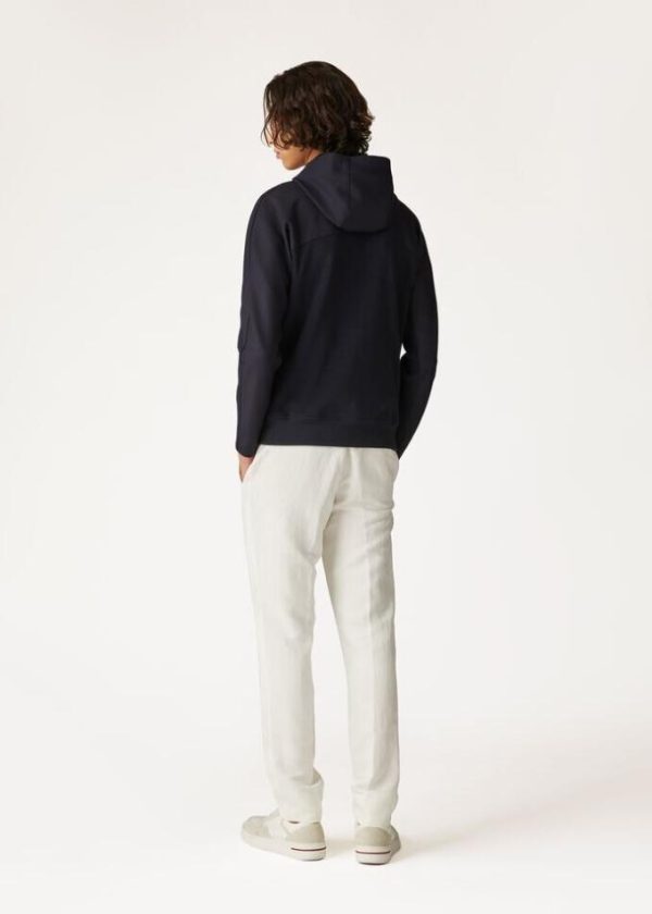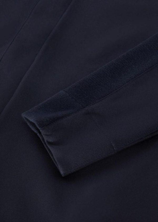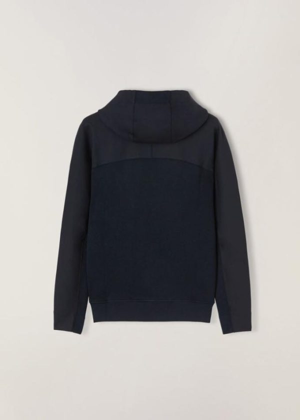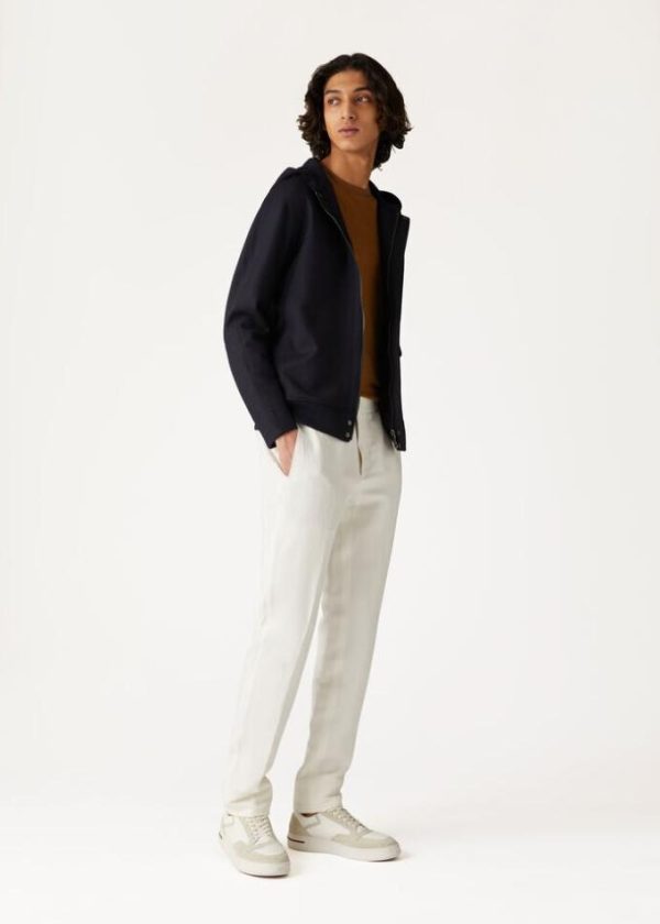 Bomber with hood crafted from double-layer stretch wool fabric styled with trim in knitted Wish® wool. Relaxed cut.