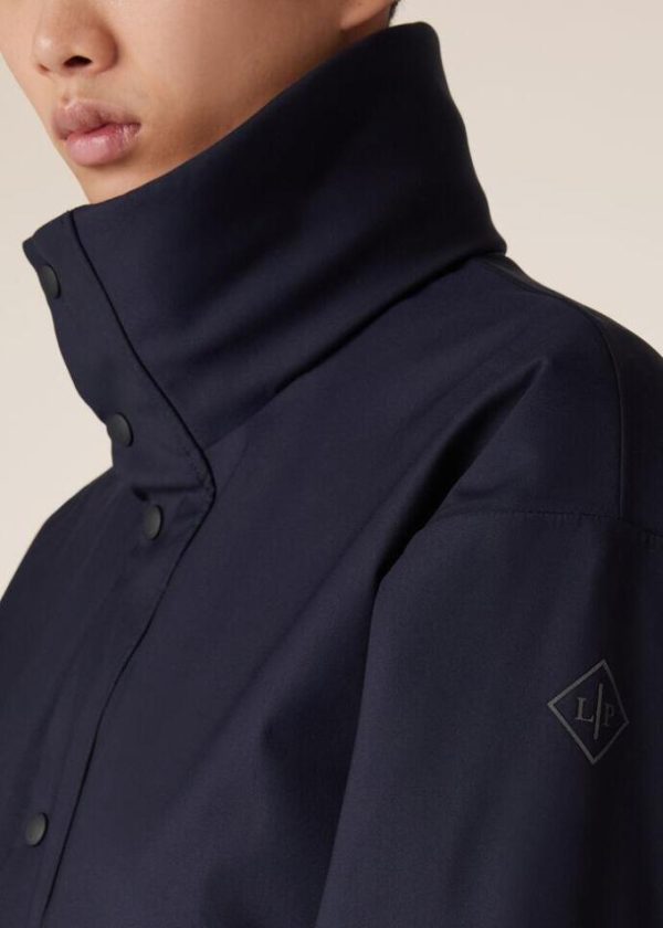 Front closure with invisible die-cast zipper and rubber logo snaps