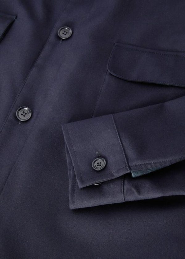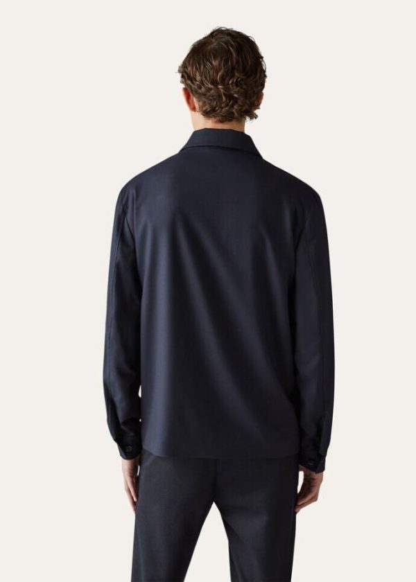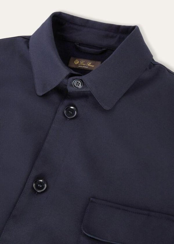 Shirt-jacket crafted from Gokmate, a very refined material with an outer layer in fabric and a knitted inner layer in The Gift of Kings®, Loro Piana’s exclusive selection of the finest wool in the world, measuring only 12 microns in diameter. Treated with Rain System® for water-repellent protection, it features patch pockets with a flap and concealed press stud on the chest.