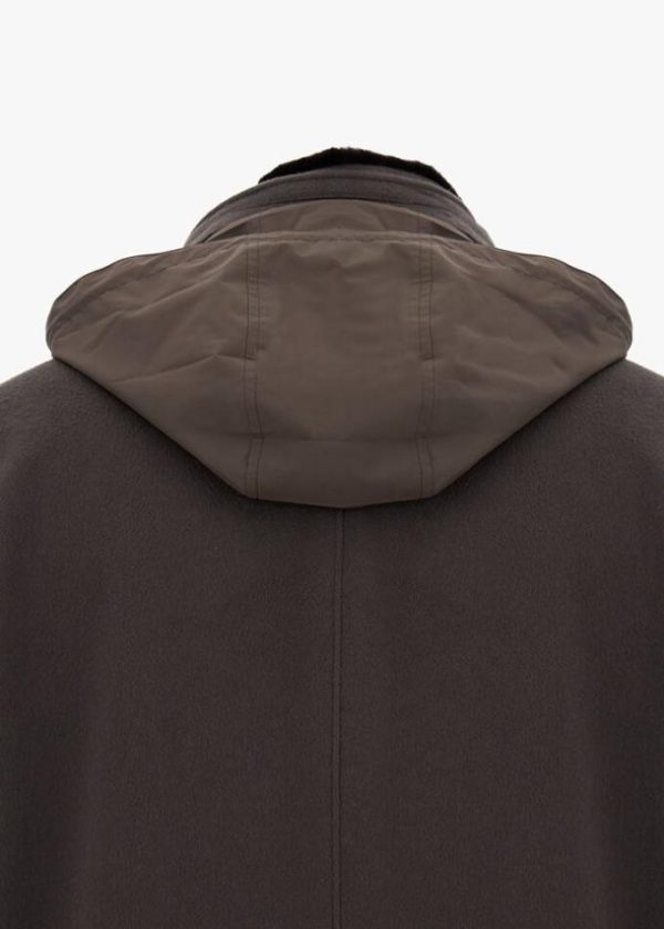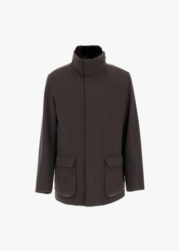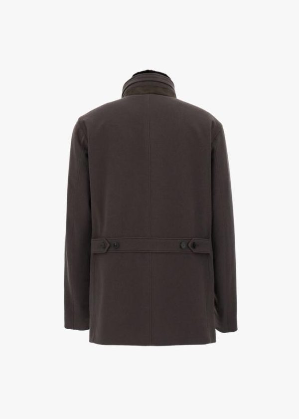 Hood in Wind Storm System®, a creaseproof, waterproof microfibre, concealed in a pocket at the rear of the collar