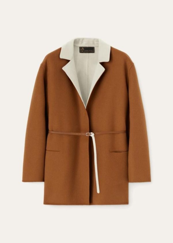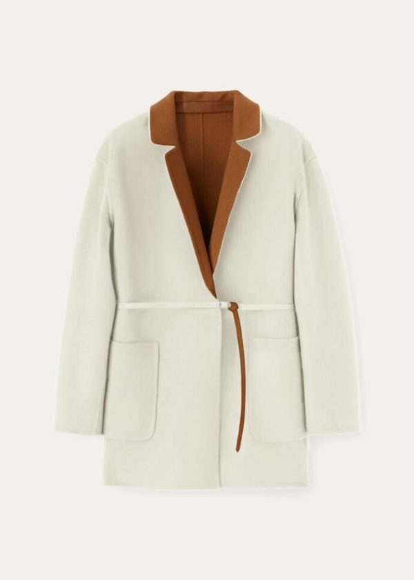 Reversible, softly cut jacket in vicuña and baby cashmere. Crafted with the double construction technique: the two layers of fabric are opened along the edges, folded back and invisibly stitched by hand. The resulting jacket is unlined, enveloping and very light, impeccably finished inside and out.