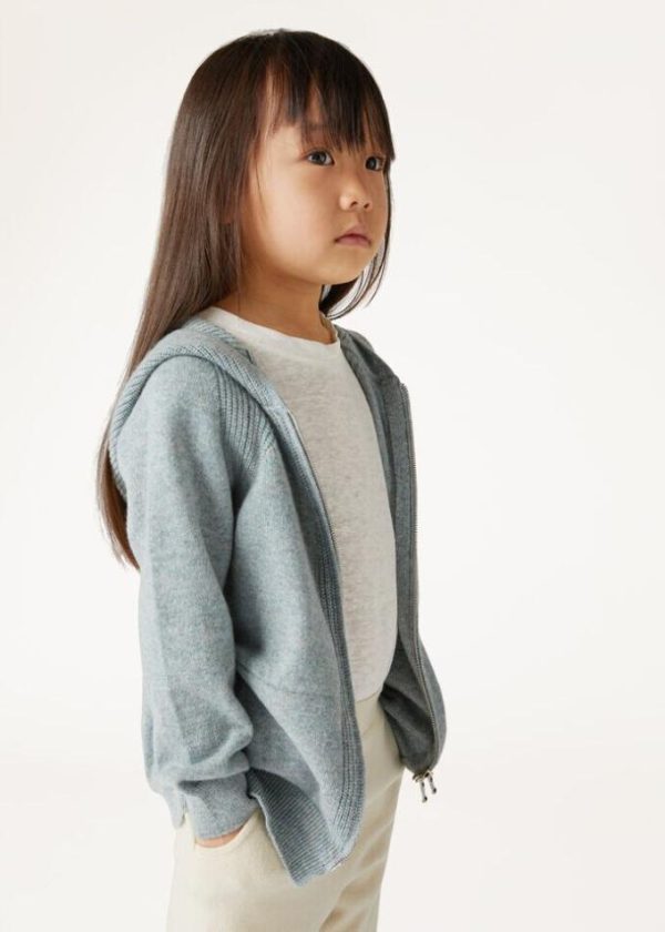 A miniature version of the hooded bomber in knitted baby cashmere. Casual and ultra-soft, ideal teamed with the Merano Trouser to create a supremely comfortable tracksuit for play and leisure time.