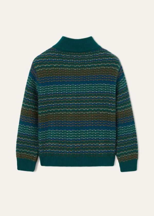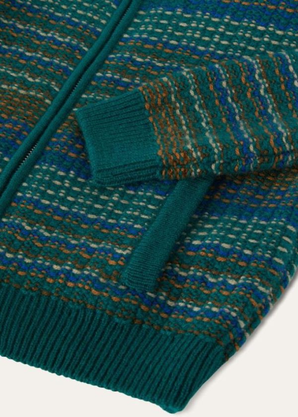 This luxurious Loro Piana bomber jacket evokes the allure of ancient Andean cultures. Crafted from naturally soft, lightweight cashmere yarn, it is defined by a sophisticated, multi-colored, interwoven jacquard weave. It can be worn everywhere, adding a touch of vibrant color on the coldest days of the year.