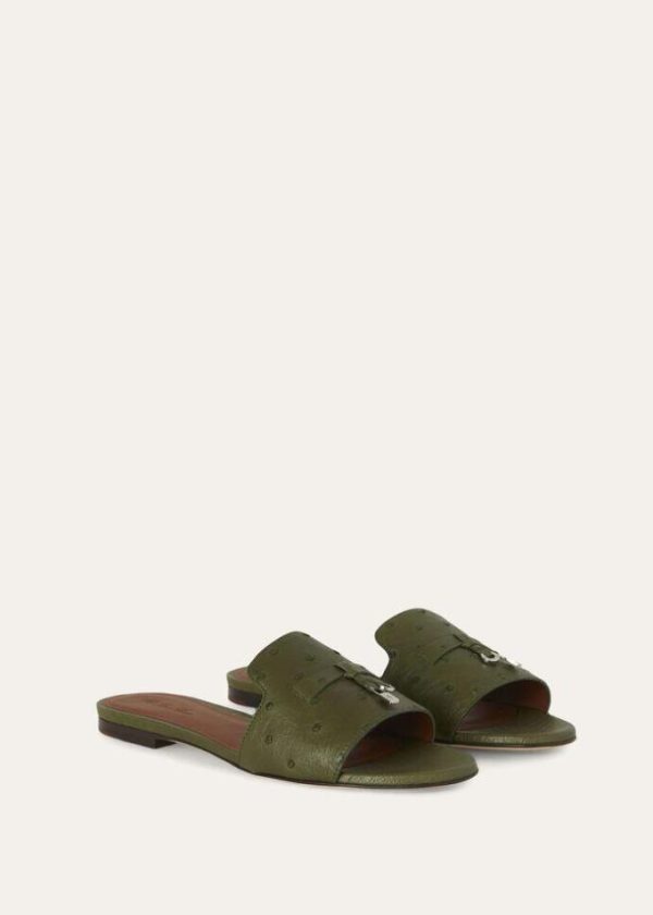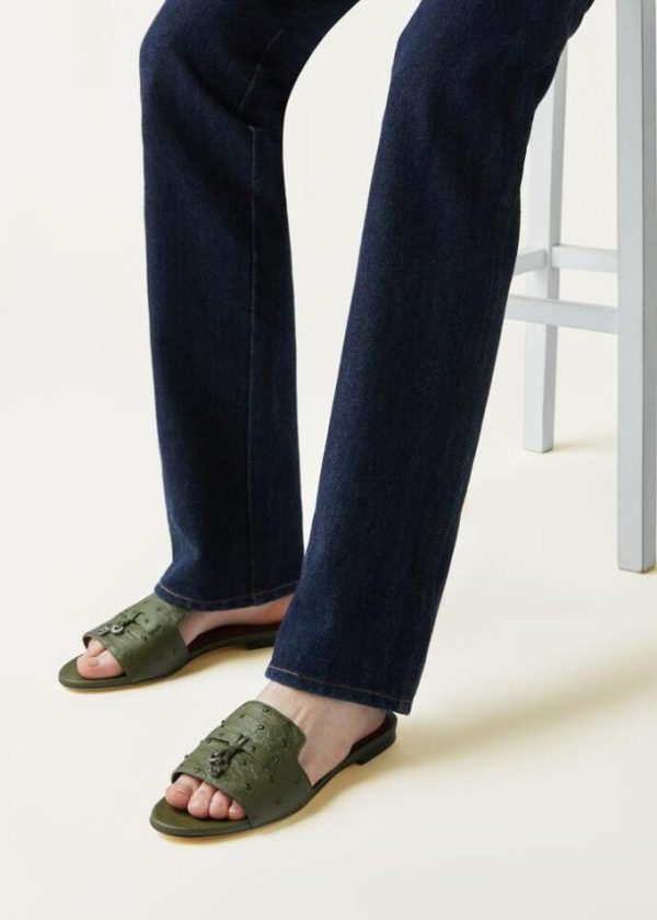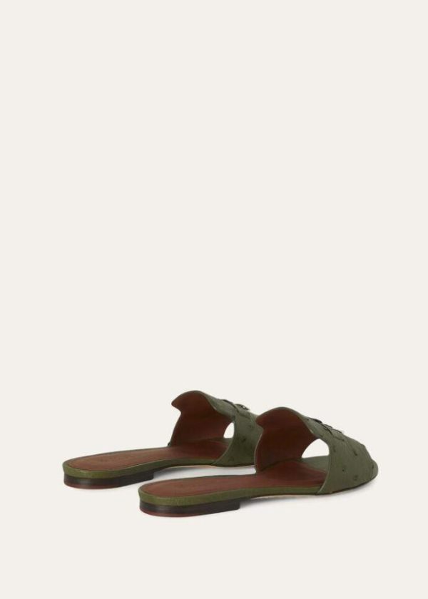 Open sandal crafted from ostrich leather. Comfortable yet very refined, it features a band with My Charms. Ideal with sophisticated looks.