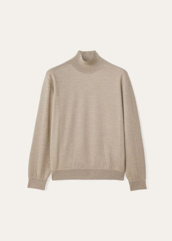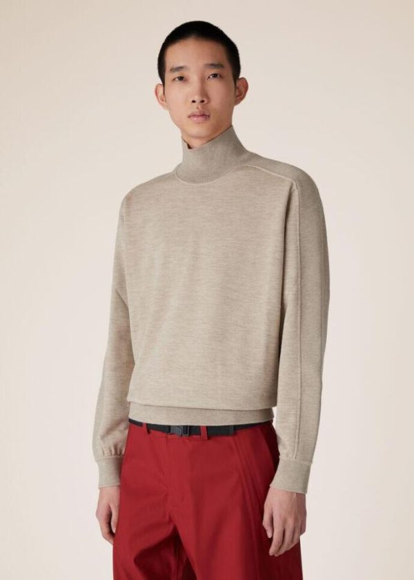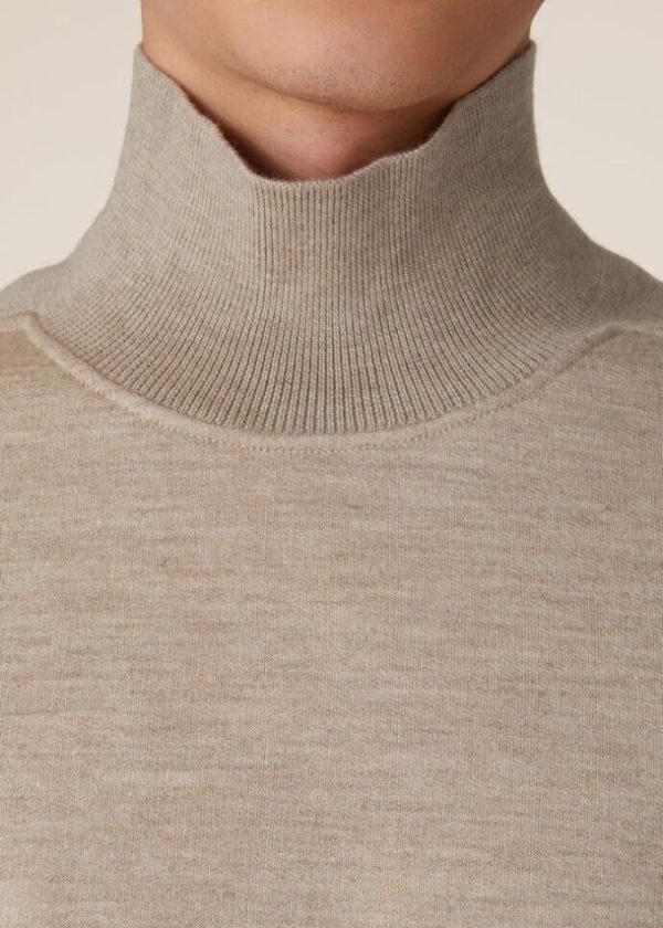 Sportswear garments for Christmas on the ski slopes. This clean-lined, turtleneck sweater features a comfortable fit. It is made from jersey crafted from naturally colored cashmere yarn, maintaining the characteristic refined softness and light weight of this prestigious fiber. Perfect for lounging and après-ski activities.
