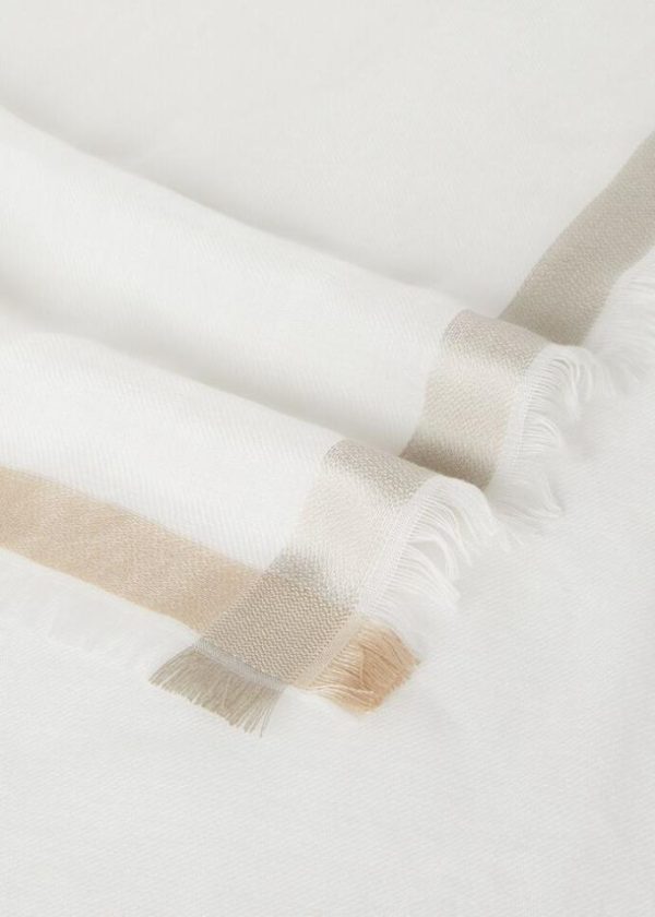 Large scarf in Soffio cashmere and silk yarn, in a light colour framed with contrasting bands of silk. The square shape guarantees versatile styling to create an endless variety of looks.