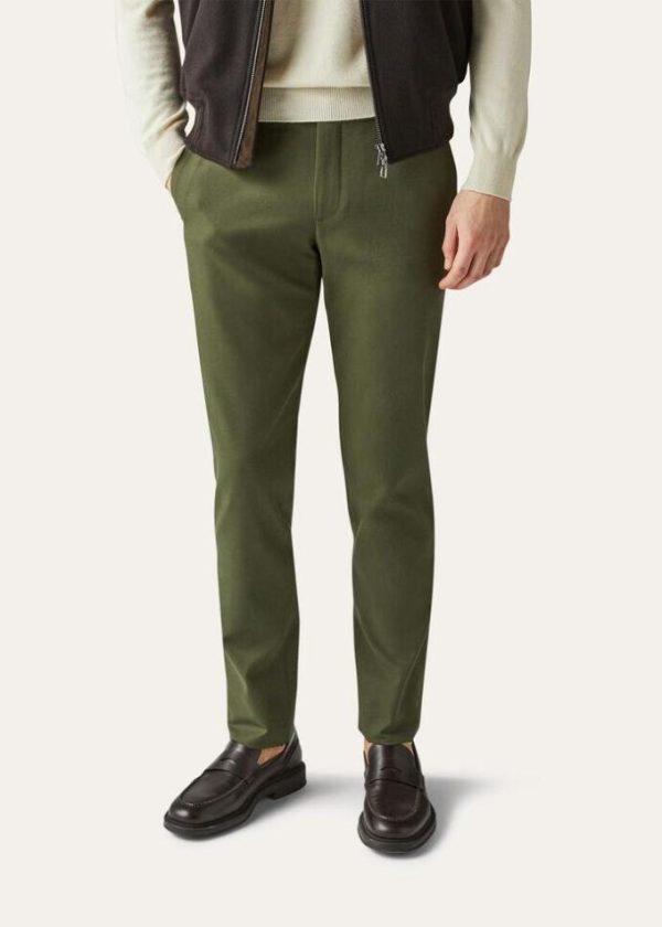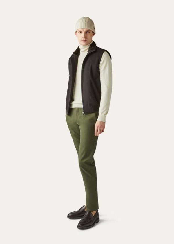 For the Fall/Winter season, Loro Piana offers the classic Pantaflat style in cotton and wool gabardine. These elegant, formal, form-fitting pants are defined by a masculine cut and flat front with no darts. The combination of natural fibers creates a fabric with an extremely soft, lustrous, fresh texture that perfectly enhances the style’s tailored construction, while accentuating the figure. Classic trousers that are perfect with business or evening attire.