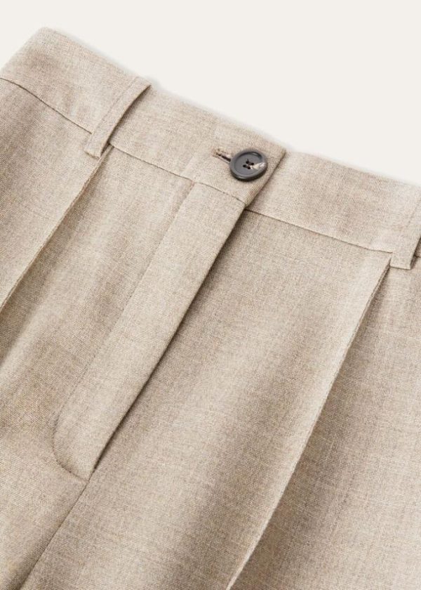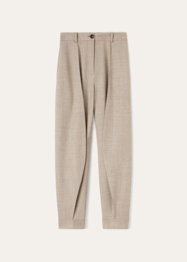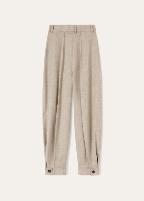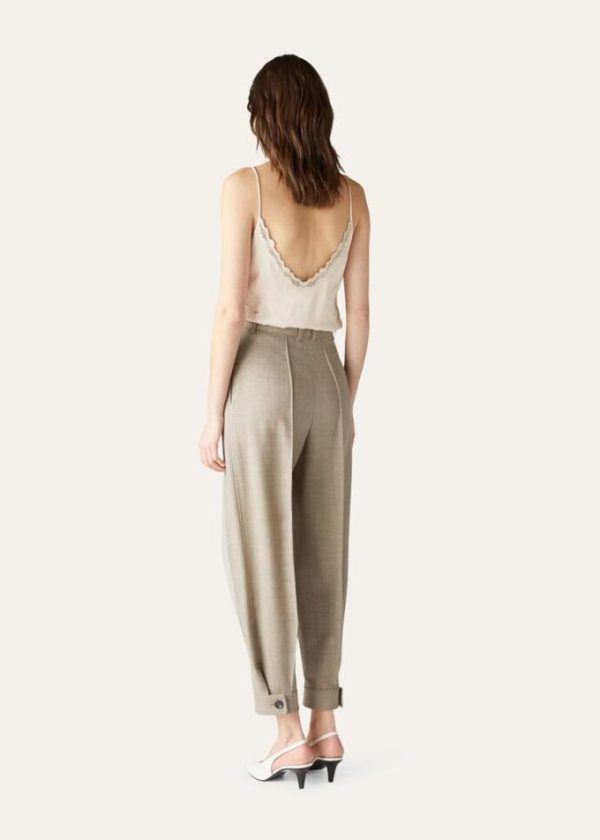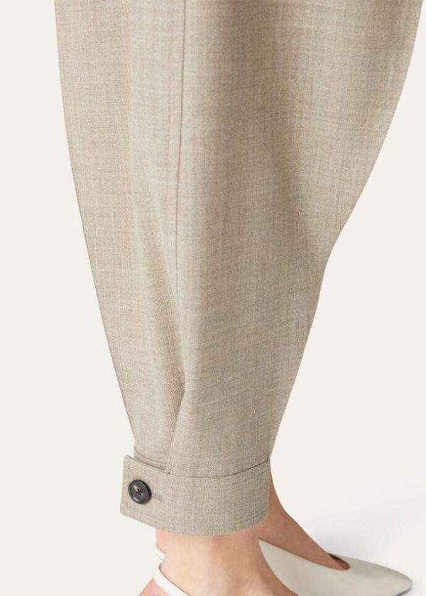 The quiet, natural elegance of the immense New Zealand landscape is embodied in a collection featuring enveloping, flowing silhouettes and a tailored allure. The Aniston pants are defined by a modern carrot fit, while a center crease on the legs accentuates their loose fit that tapers at the cuffs, thanks to a strap with double-button closure. Crafted from Italian virgin wool, the breathable fabric has a rustic, vintage-style feel — an exclusive material enhanced by the Italian tailoring tradition.